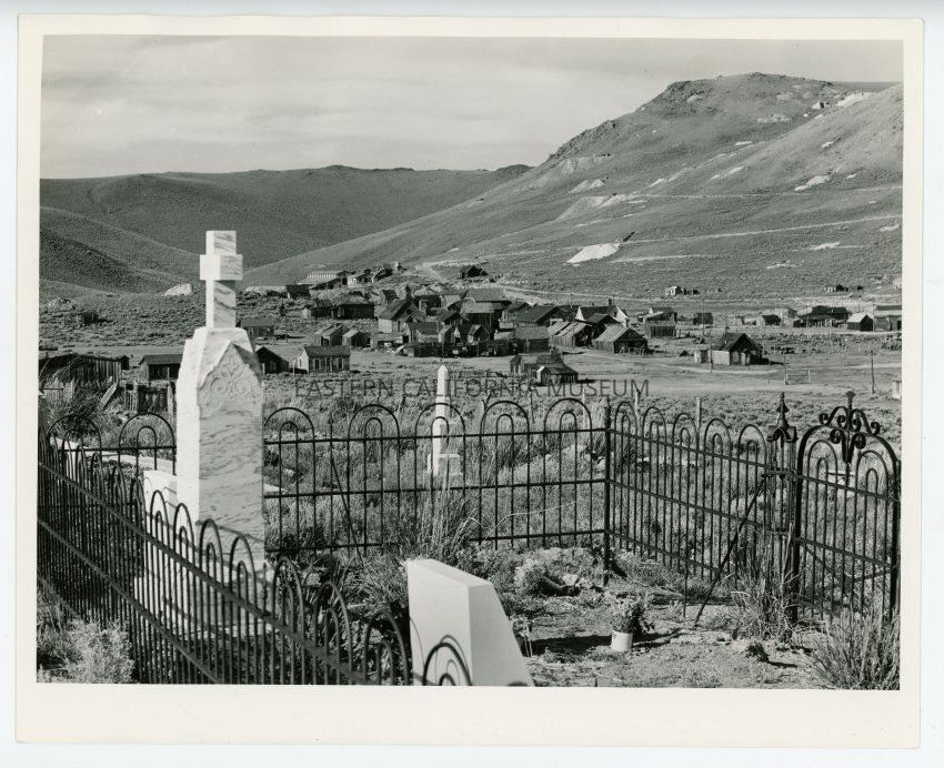 Photo of Bodie taken from the cemetery. Headstones and fencing in foreground. Handwritten in pencil on reverse: Bodie c. 1930.