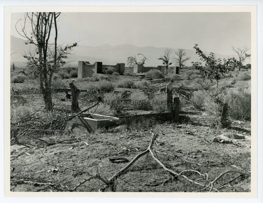 This is a duplicate of a photo from accession number A1122, whose description on the reverse reads, "Owens Valley. Showing wreckage of the Owens Valley after Los Angeles water grab. Deserted homes and ranches."