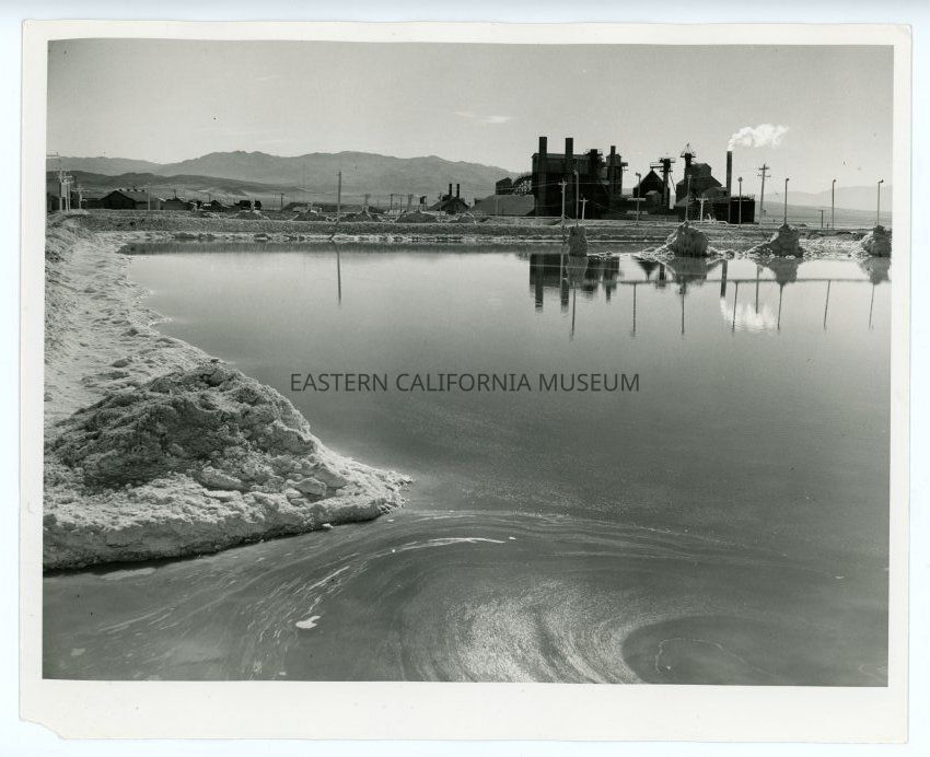 Photo of what appears to be a shallow evaporative pond on the Owens Lake with a factory or plant in the background [NSP / Natural Soda Products?].