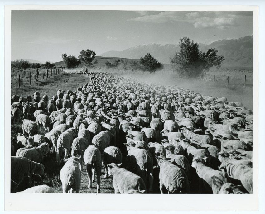 Photo of a flock of sheep walking down a dirt road. A sheepherder and dog are visible in the distance. Handwritten in pencil on reverse: Sheep c. 1930.