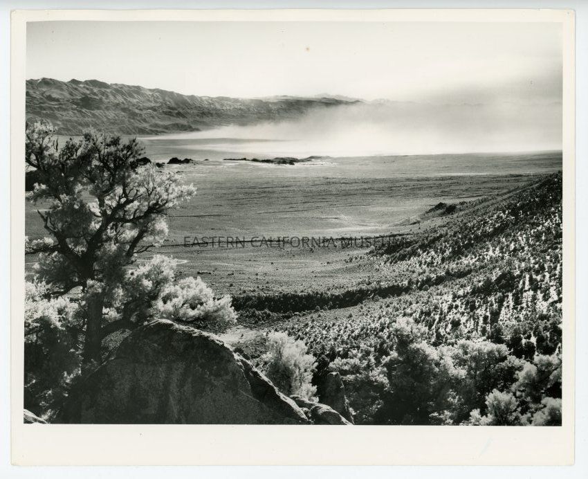 Photo of a valley as seen from a high vantage point. Appears to be a dust storm in the distance, maybe the Owens Lake? Rock and tree in left foreground.