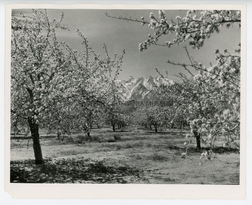 Photo of a blossoming orchard with the Sierra Nevada in the background. Handwritten in pencil on reverse: Near Lone Pine, 1930-3.