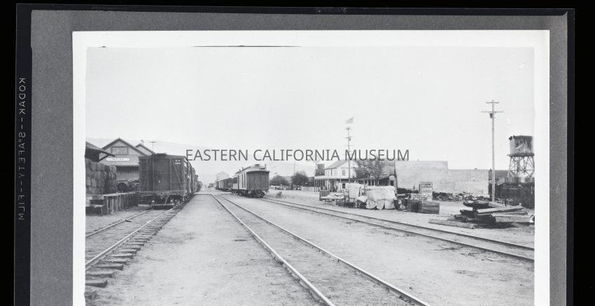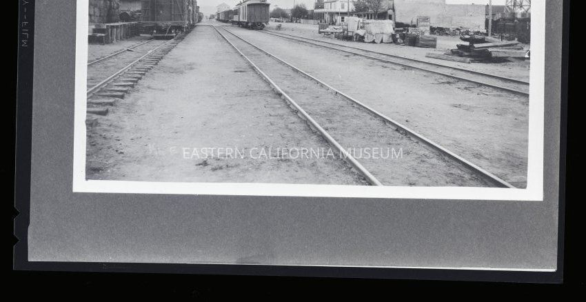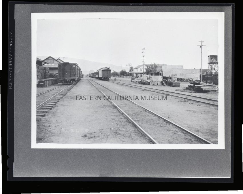 Photo of Keeler taken looking southeast at the railroad station, rail yards, Hotel Keeler, A. T. Smith General Store, and the Sierra Talc Company's Mill in the distance. Photo copied courtesy of Margret Sparovahn in 1956.