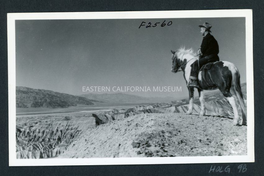 [No label] F2560 Copyright Frashers Fotos Pomona Calif. This is a photo of a lone man on horseback looking out at rock formations in Death Valley.