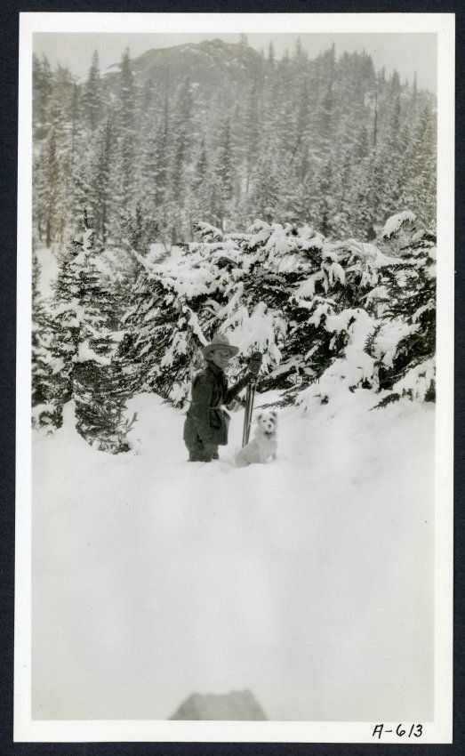 [No label, and it seems to have been skipped in the inventory.] [No label] A-613 This photo is of Burton Frasher, tripod, camera, and dog in a snowy winter scene.