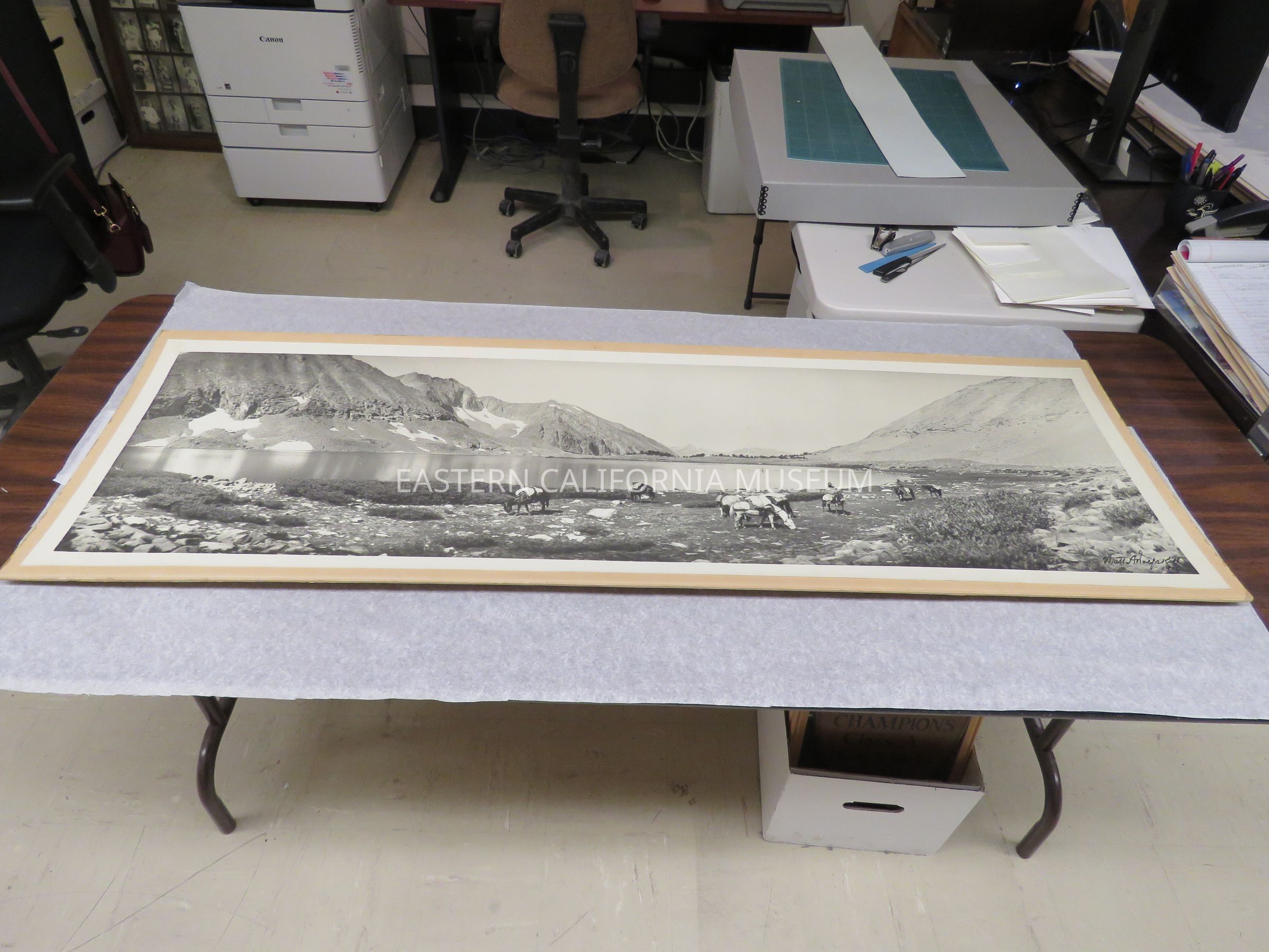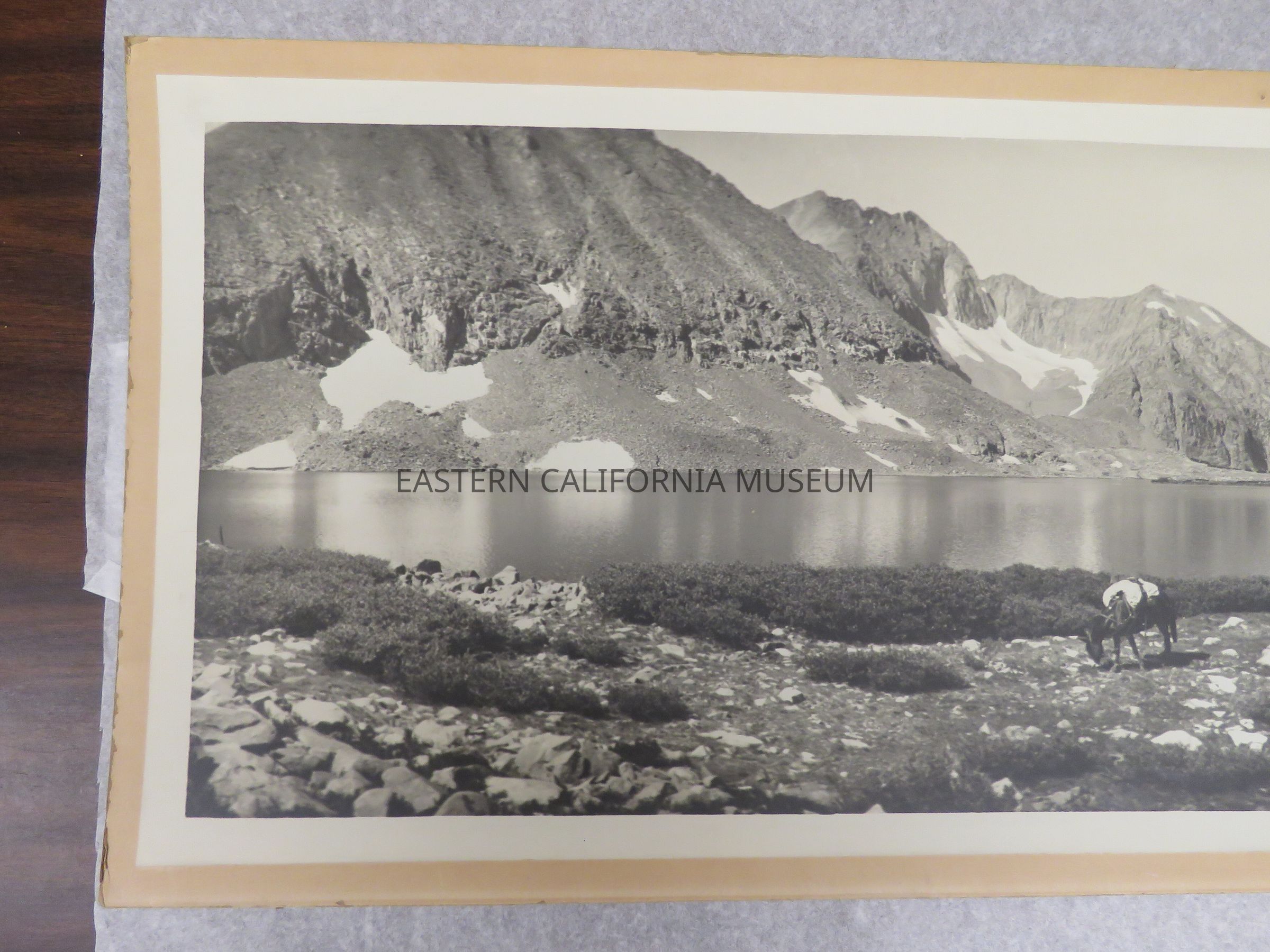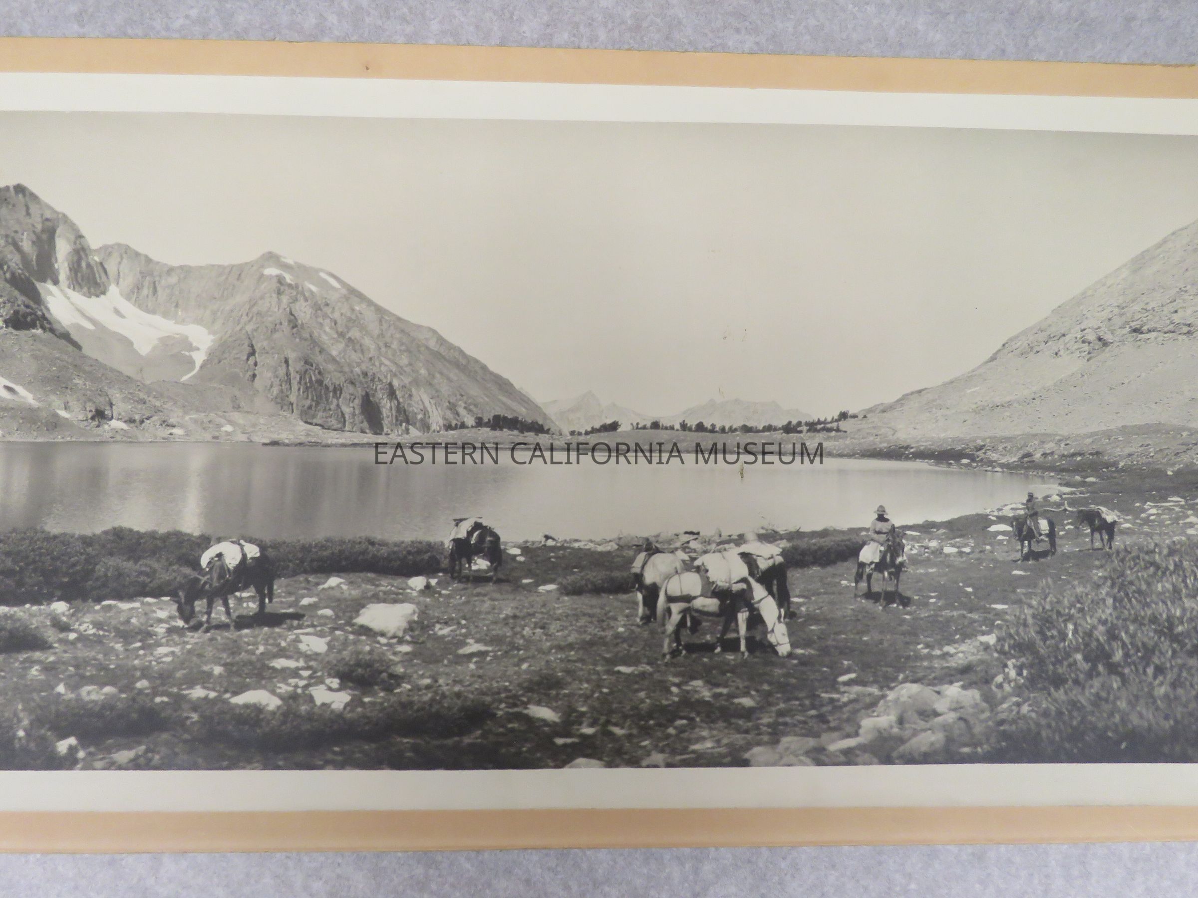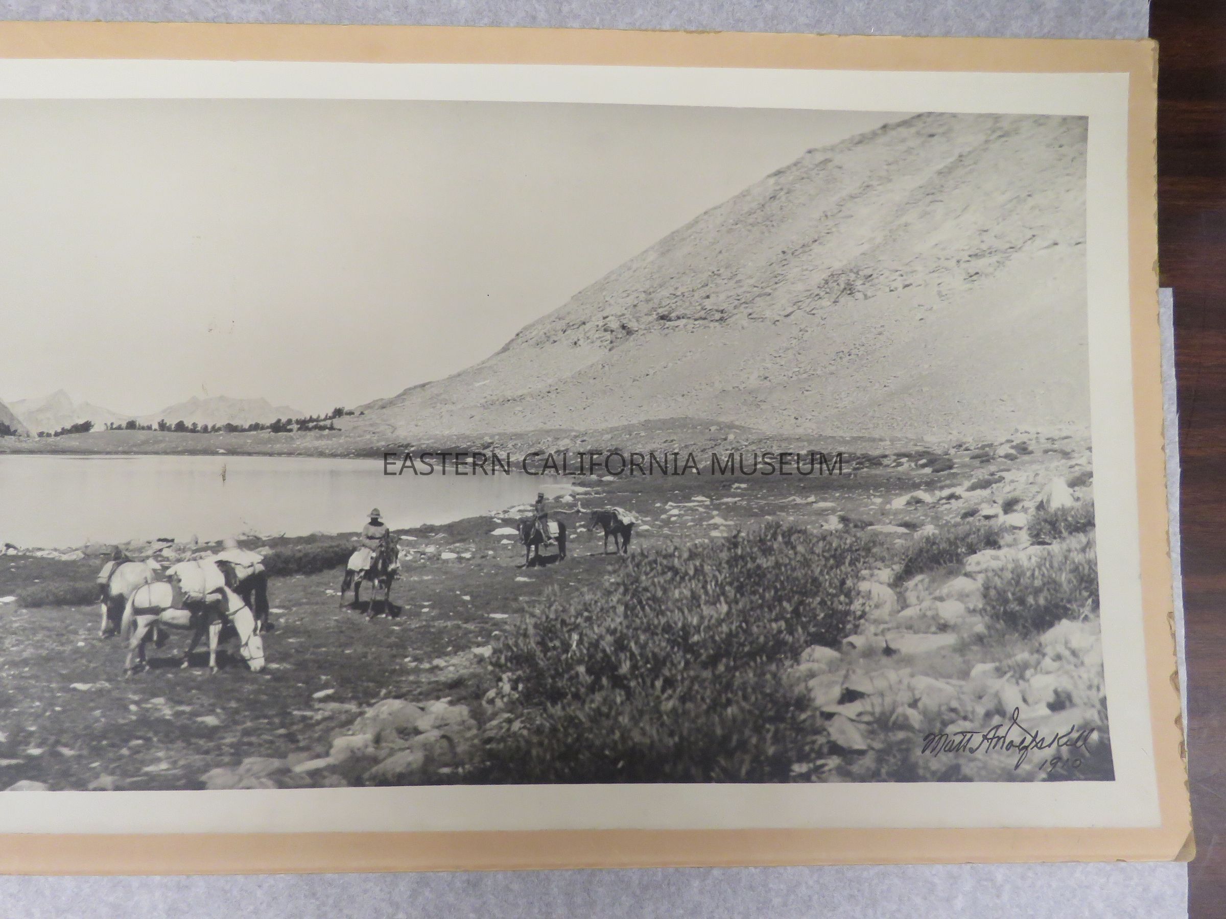 Photo of a packtrain grazing next to Baxter Lake. There are patches of snow on the opposite side of the lake. Signed by Matt A. Wolfskill, 1910. Same photo as 1993.45.239.Made/Created