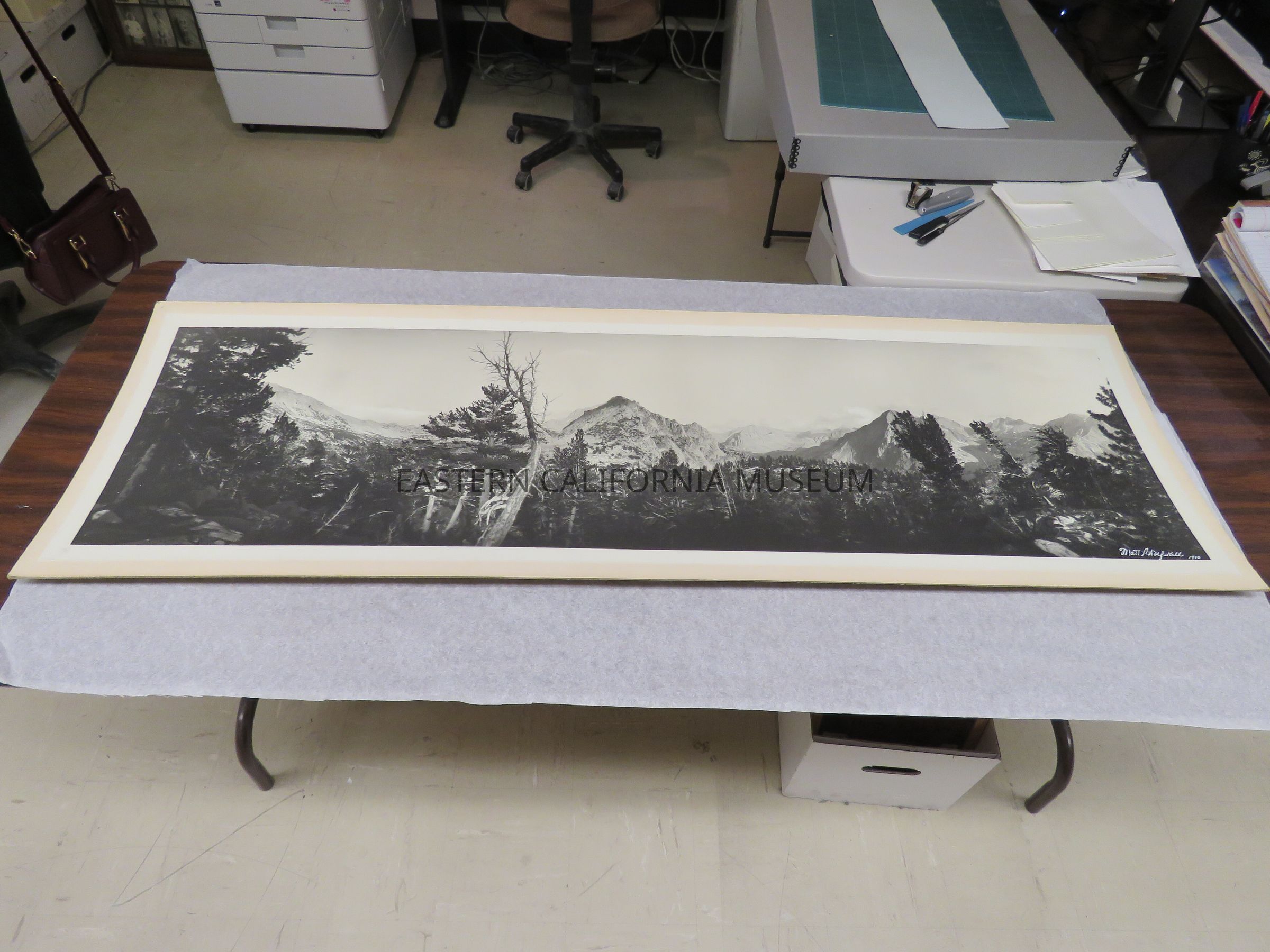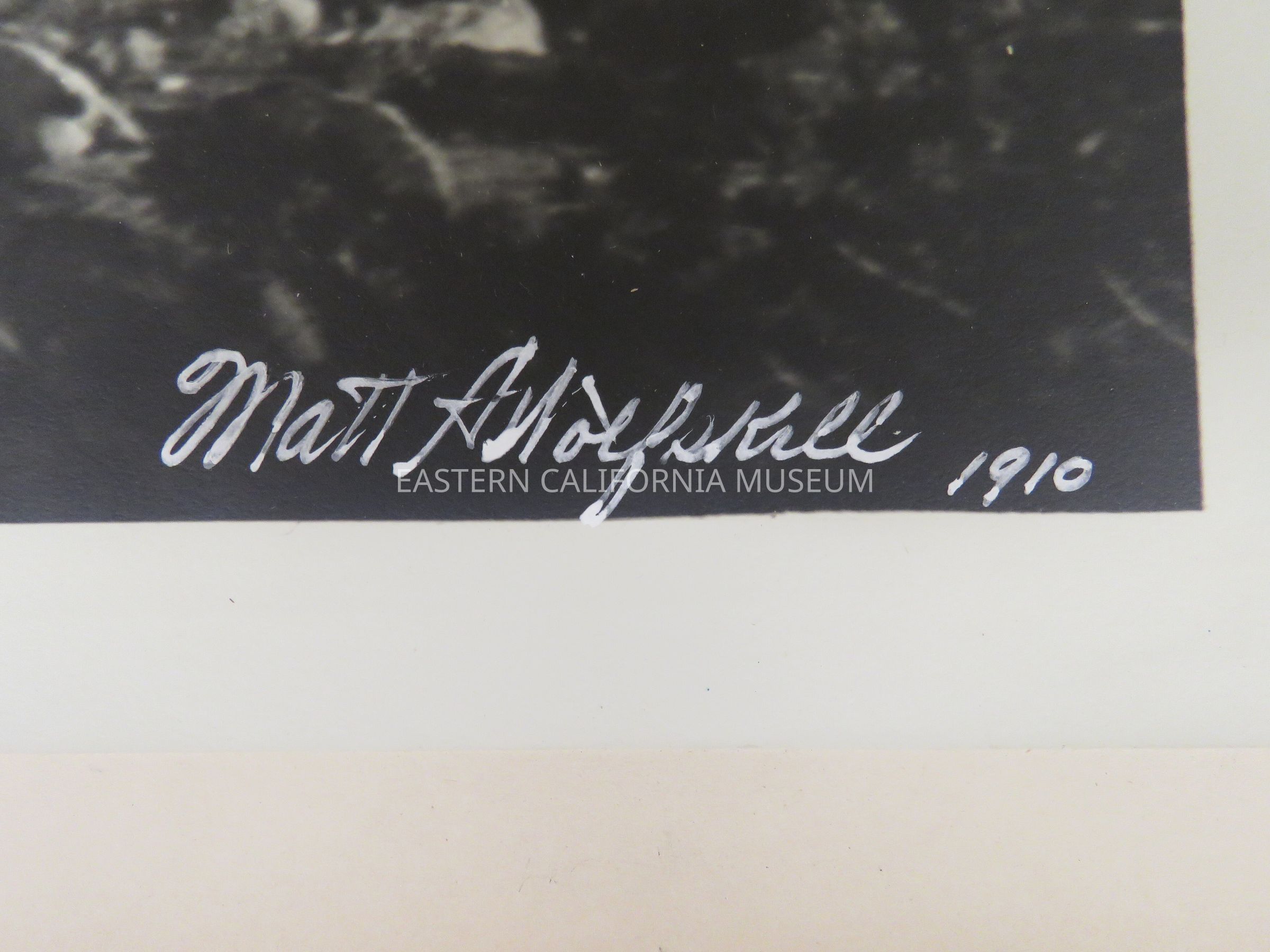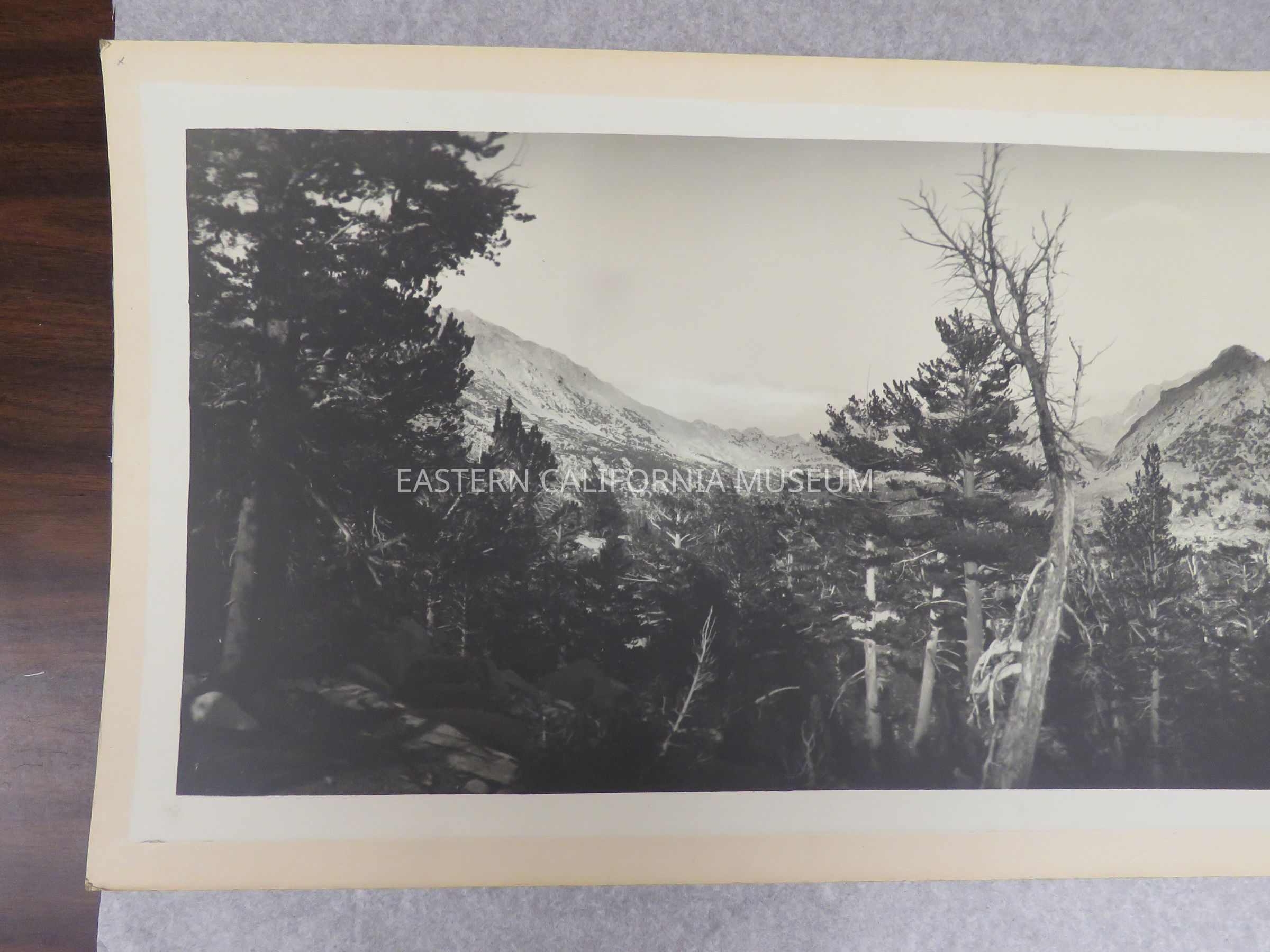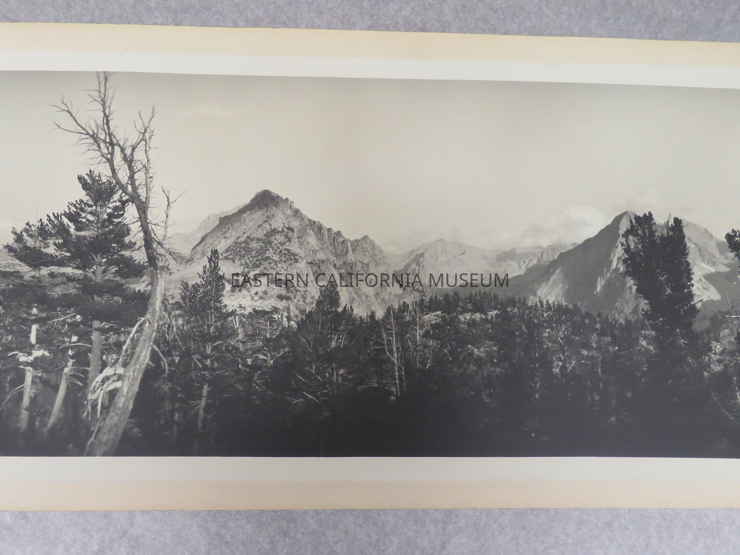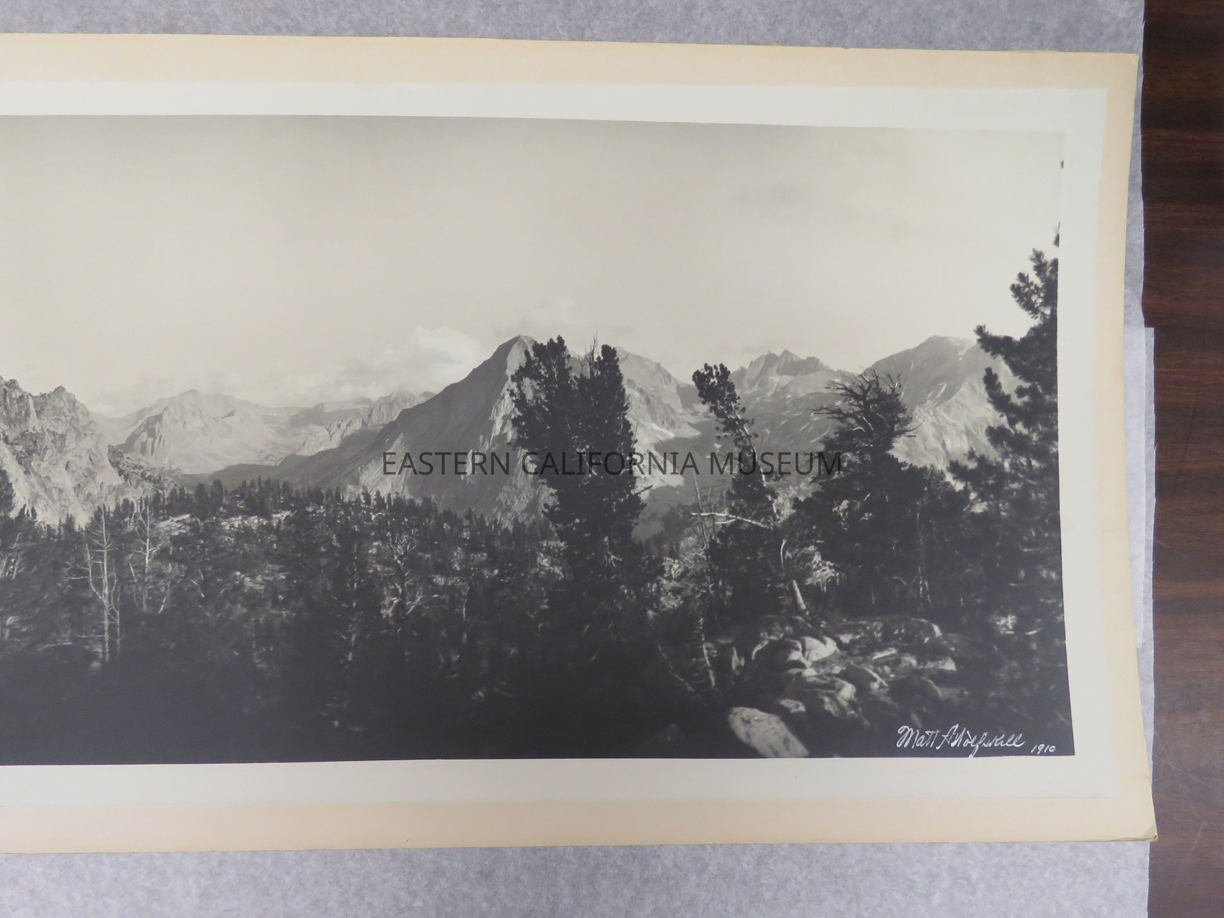 Photo of Kearsarge Pass (on left) and Kearsarge Pinnacles, looking south from above Bullfrog Lake. East Vidette Peak, look up toward Harrison Pass (Forester Pass). Signed by Matt A. Wolfskill, 1910. Same photo as 1993.45.182.Made/Created