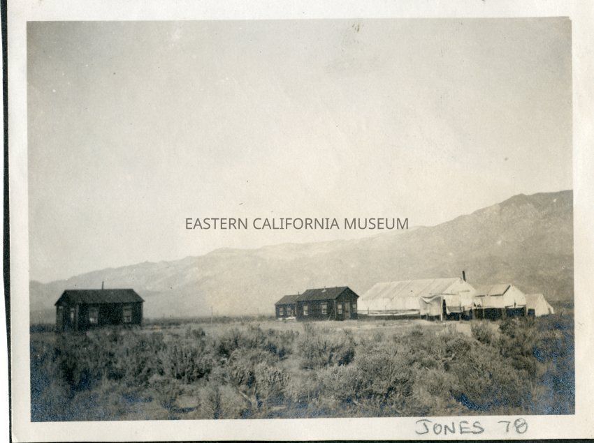 L.A. Aqueduct construction camp (in the Owens Valley?) showing two types of housing: wooden structures and tent cabins.