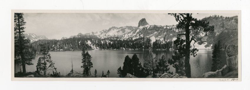 Photo of a mountain lake with large patches of snow all around. There is a distinctive mountain peak near the center of the photo. Same photo as 1993.45.4.
