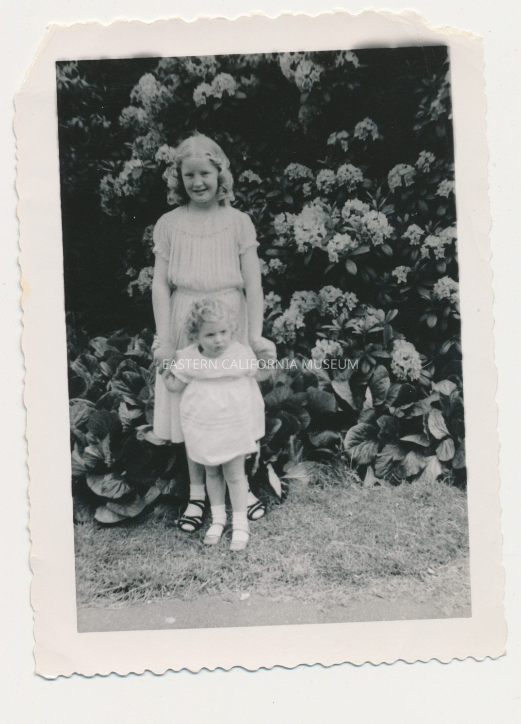 Photo of a young girl and a toddler standing in front of a flowering bush. Written in pencil on reverse: Thelma Ruth Smith, Shelley LaRee.