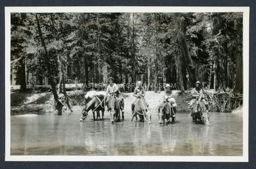 [No label, and it seems to have been skipped in the inventory.] [No label] [No number] This photo is of four people and five horses fording a river crossing.