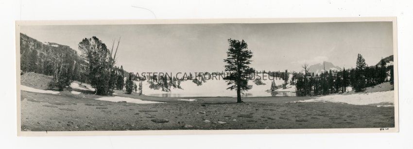Photo of landscape with a lake and pine tree in center, patches of snow around, distinctive mountain peak in distance. Same photo as 1993.45.5.