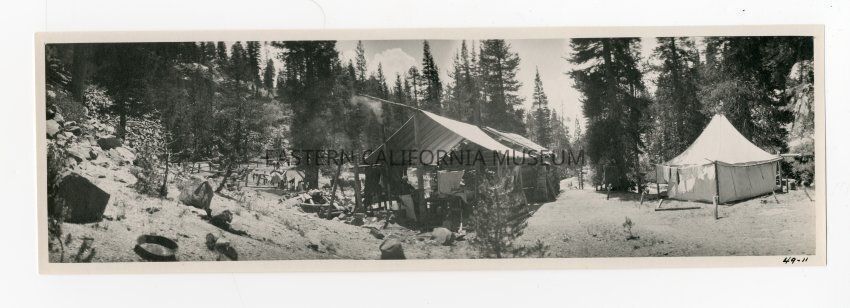 Photo of a log cabin with an outdoor, canvas tent covered kitchen (chef wearing apron inside). There is a canvas tent off to the right and a corral for pack animals to the left. Same location as 1993.45.37.