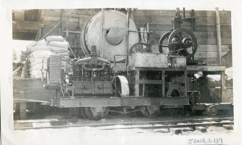 A gasoline locomotive used in L.A. Aqueduct construction. It may be a portable cement mixing unit. Note cement mixer in upper middle of print and sacks of concrete on loading dock.Collection