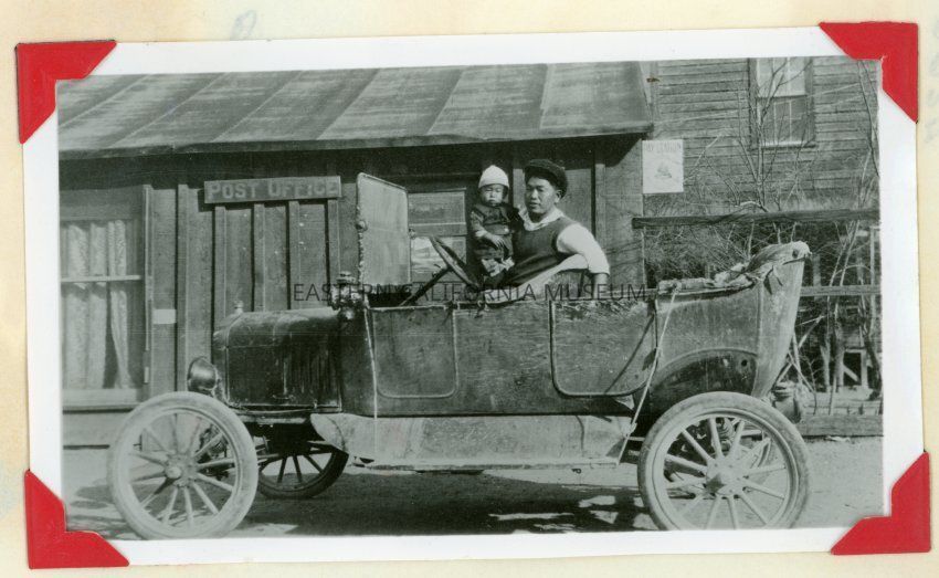 Photo of a Chinese man and child in a vehicle parked in front of the Keeler Post Office. Photo copied courtesy of L. Hilderman in 1959.
