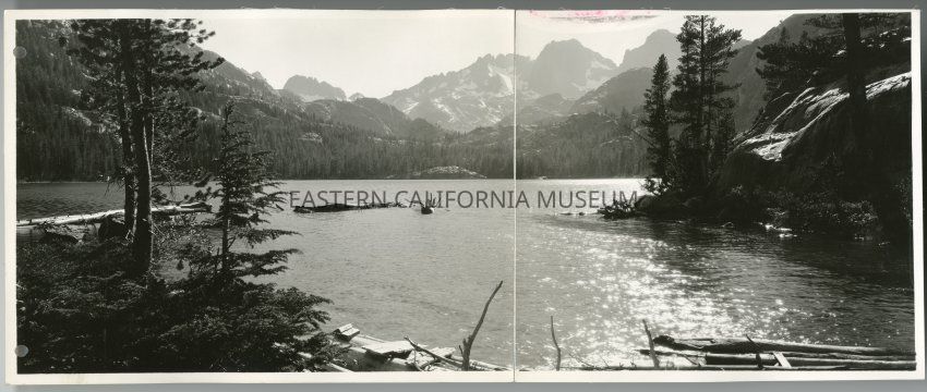 This is a panorama printed on two sheets with cloth backing. Underneath the cloth backing is "7-449." This photo is of a lake. There is some pink discoloration along the top of this photo.