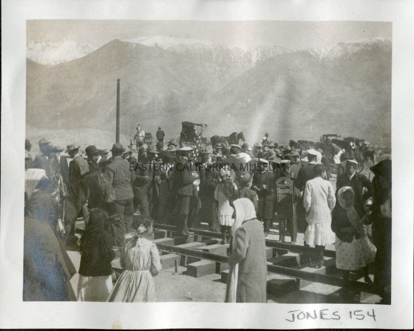 Crowd gathered at Owenyo for the dedication of the Southern Pacific broad gauge railroad line (Jawbone Branch) coming up from Mojave and meeting the narrow gauge branch.Collection