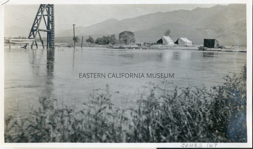 L.A. Aqueduct construction camp, maybe around intake site. Piledriver to left appears underwater, possbily from flooding.