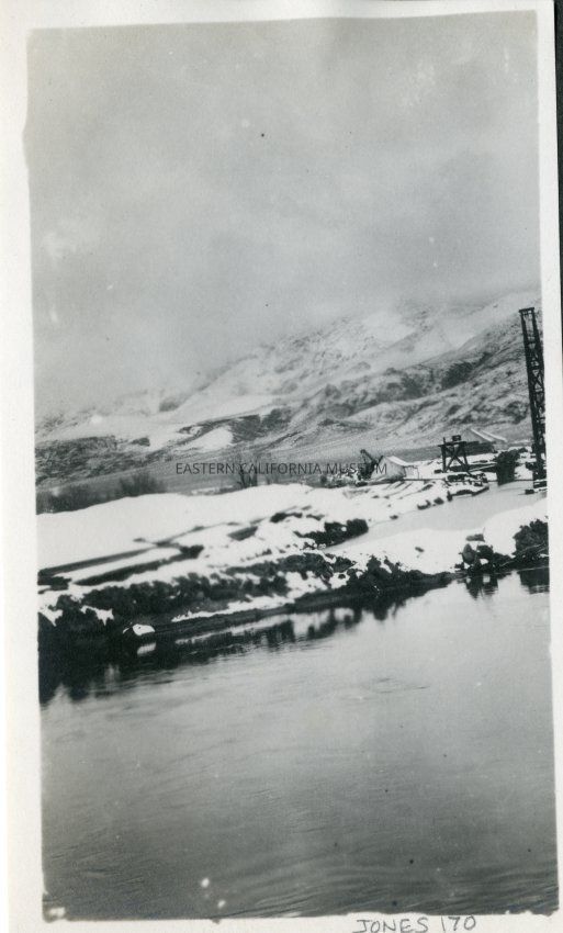 Winter at L.A. Aqueduct construction camp near intake. There is a piledriver at right edge of photo.
