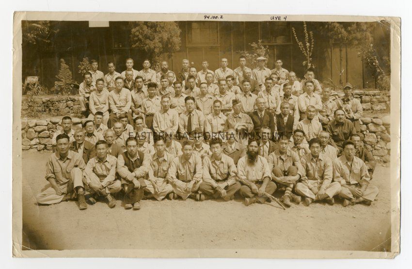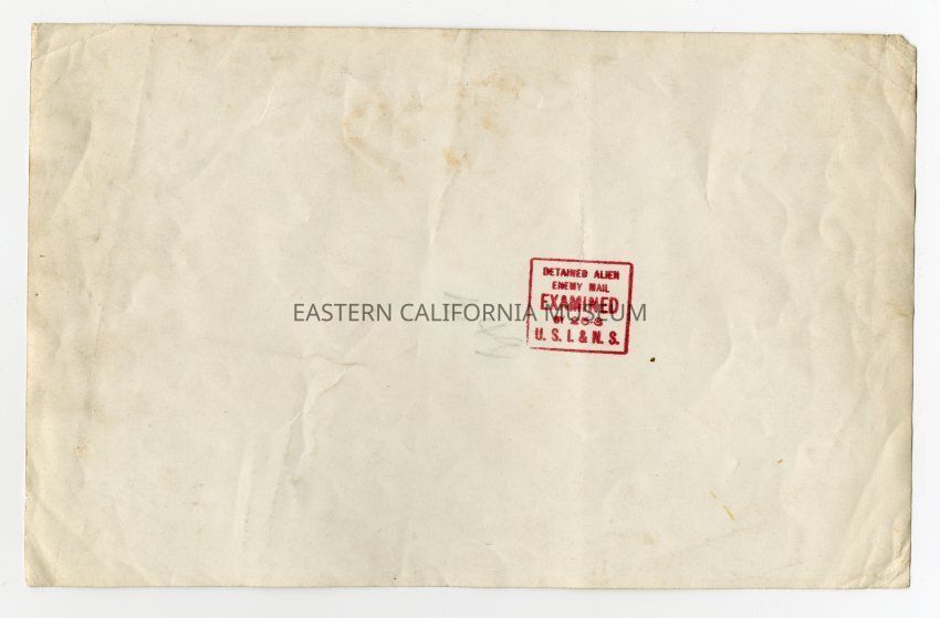 Exterior photograph of (estimated) 70 men in six rows in front of two stone retaining walls with a tar paper covered wall of a building on top of the retaining walls. This photo is probably of the Santa Fe Internment Camp. Tatsunosuke Uyemura is probably in the photo, but not identified. Tatsunosuke left Manzanar in 1944 for Tule Lake, and left Tule Lake in 1945 with a destination of the Santa Fe Internment Camp. On reverse of photo is a stamp: "Detained Enemy Alien Mail EXAMINED by 25- 3 U.S.I.&N.S."Photograph Details