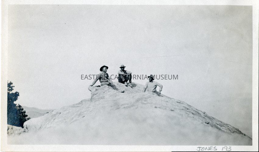 Three men sitting on top of a rock, peak, or mountain.