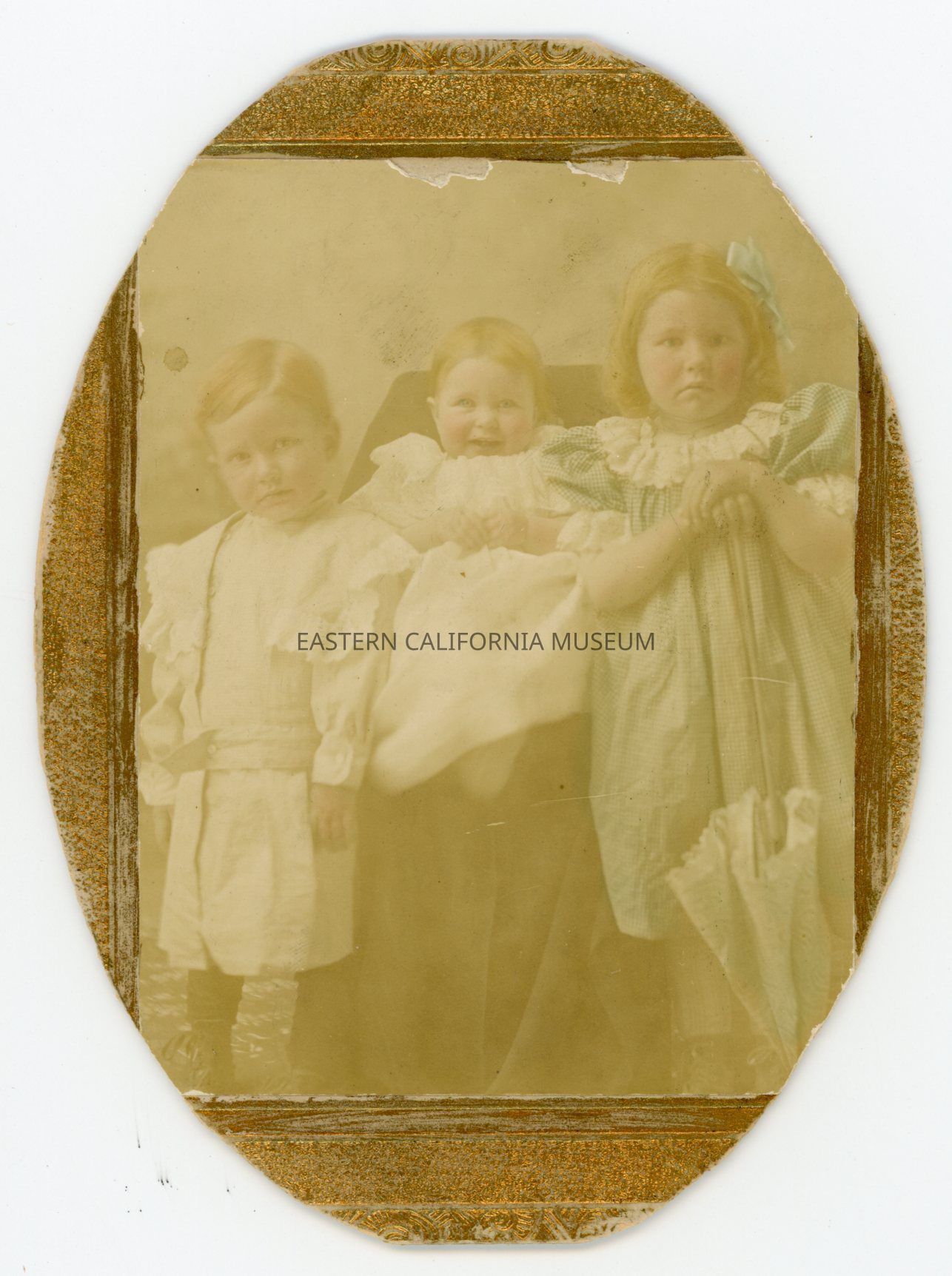 Mounted studio portrait of three young children who are identified on the reverse as William [William David Drew], Ora [Ora Drew], and Nellie [Nellie Ann Drew] about 1902. The photo has been hand tinted and the mount is gold. The photo and mount have been cut down into an oval shape. The photographer is unknown, but the location is likely Arizona.