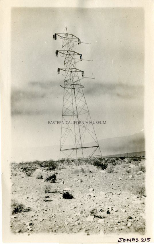 High voltage power tower. Note electrical lines have yet to be installed on insulators. Photo taken looking south down Owens Valley.Collection