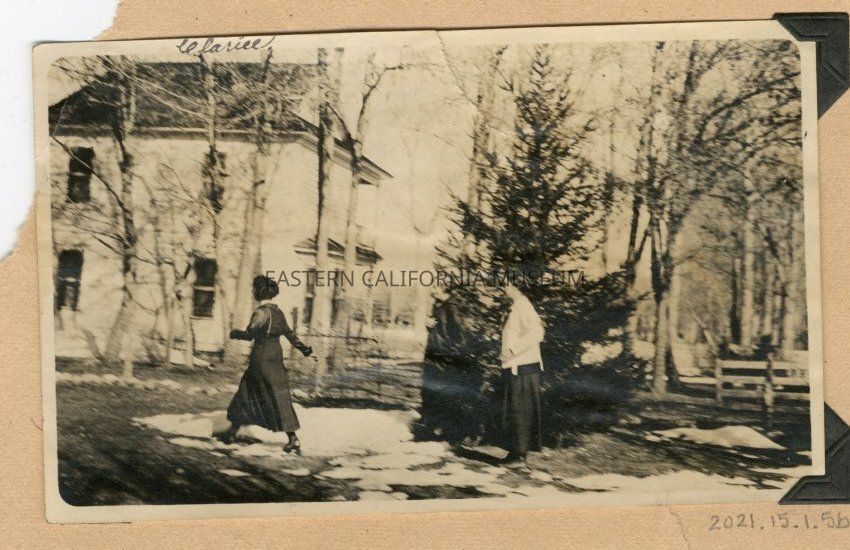 Photo of three women walking in front of a small pine tree with a two story building in the background. Maybe the courthouse? The woman on the left is identified as Clarice.Collection