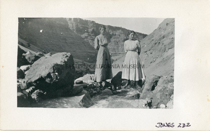 Postcard with two unidentified women standing at bottom of canyon by a creek or stream.
