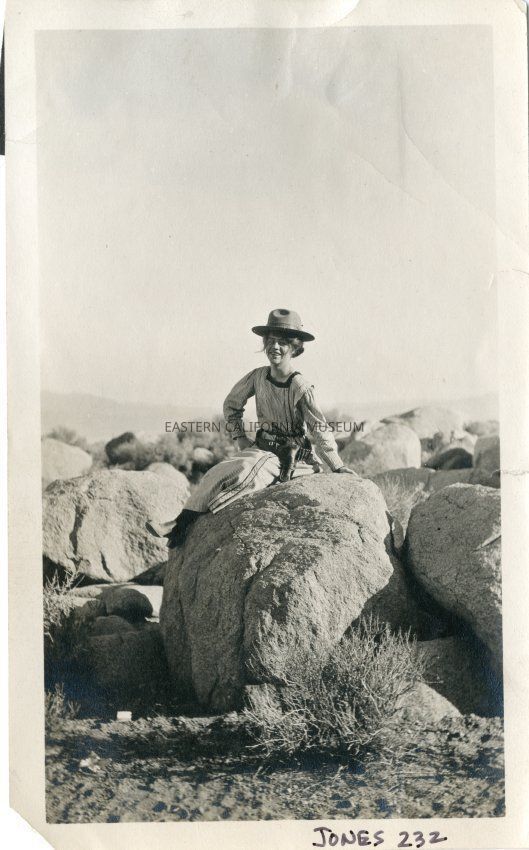 Unidentified female "gunslinger" posing on a boulder. The location may be Alabama Hills.