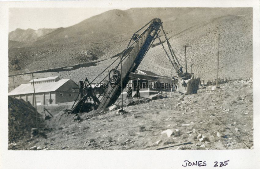 Marion steam shovel excavating channel for L.A. Aqueduct at Cottonwood Power Plant. Laborers in center of print. Photo taken looking north to Sierra Nevada foothills.Collection