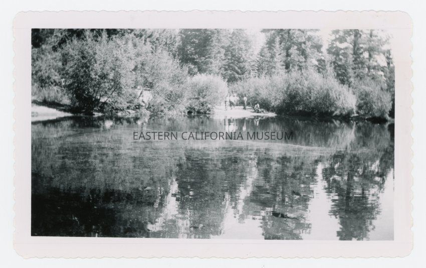 Photo of a lake or pond with people (fishing?) on the opposite bank. Written on reverse: [Whitney] Portal 1954.