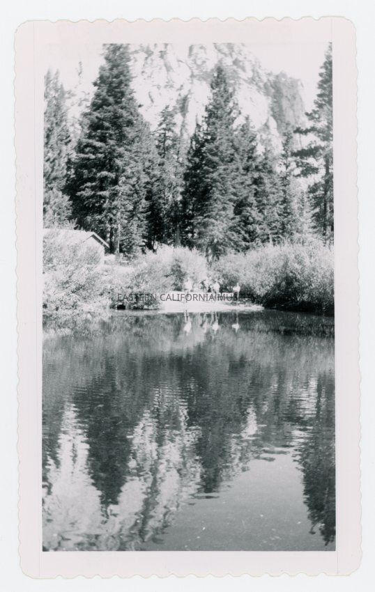 Photo of a lake or pond with people (fishing?) on the opposite bank. Written on reverse: [Whitney] Portal 1954.