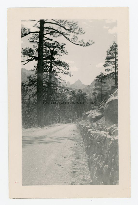 Photo of a road and stone retaining wall with Mt. Whitney in the distance. Written on reverse: Portal.