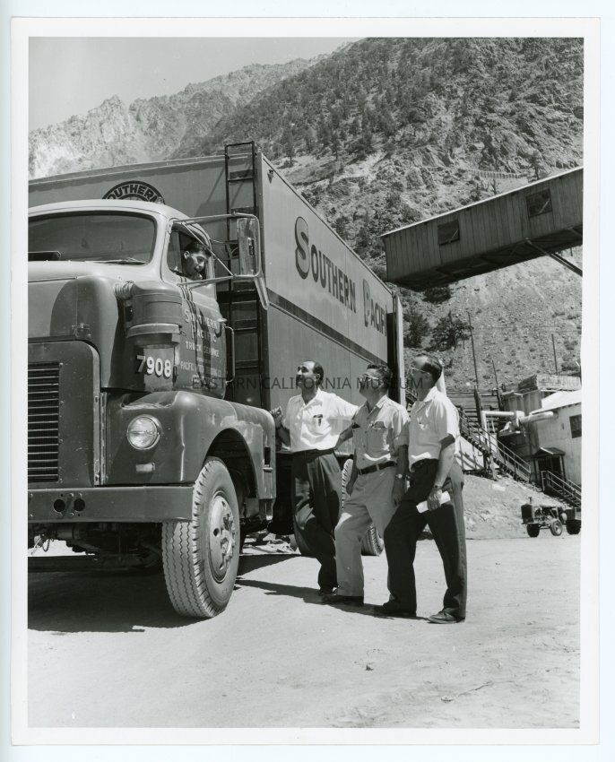 Photo of three men standing next to a Southern Pacific Truck Service truck with a young man in the driver's seat leaning out the window towards them. Location is the Union Carbide Pine Creek Mine or Mill with some buildings/structures visible in the background