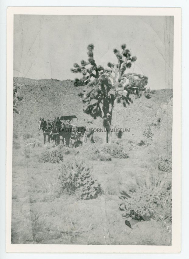 Copy of a photo of a team of horses and a buggy or coach next to a yucca tree. One man is in the conveyance and other man appears to be carrying a cask or barrel.