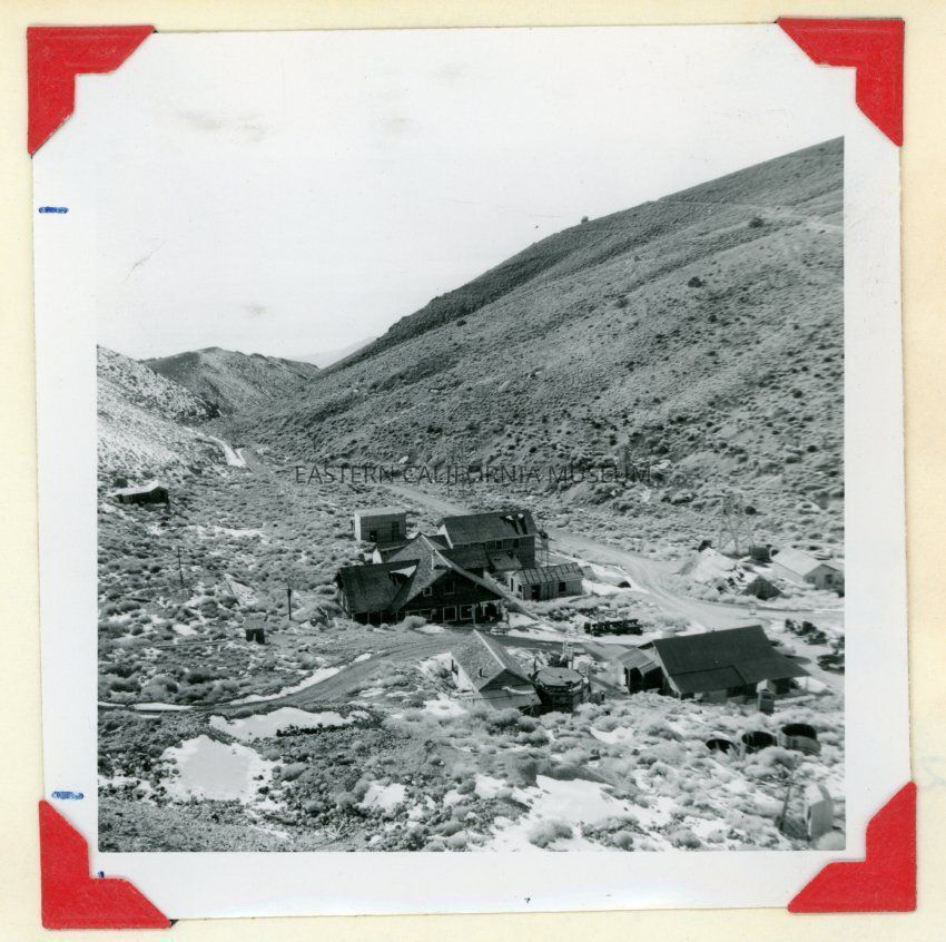 Photo of the town of Cerro Gordo as viewed from the hoist house. Photo taken by C. Krautter in 1959.