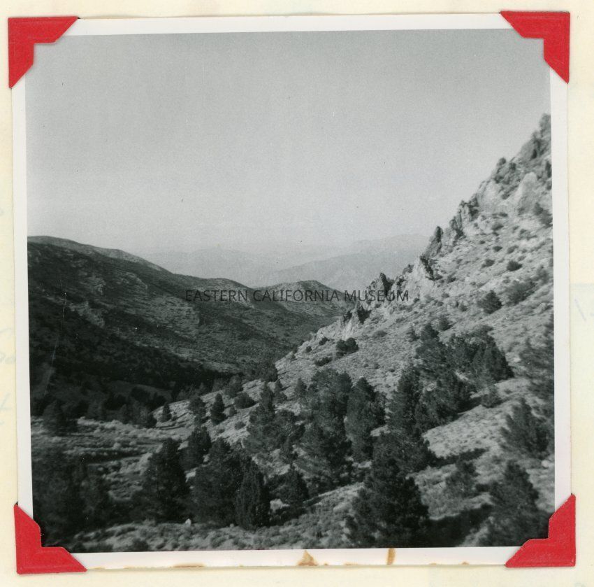 Photo of the mountain/canyon landscape looking toward Saline Valley from Cerro Gordo. Photo taken by W. P. Payne in 1957.