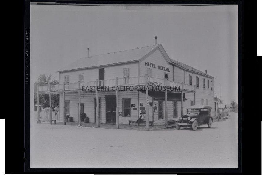 Photo of the Hotel Keeler and restaurant (and barber shop?) about 1921. Original courtesy of Margaret Sparovahn of Lone Pine.