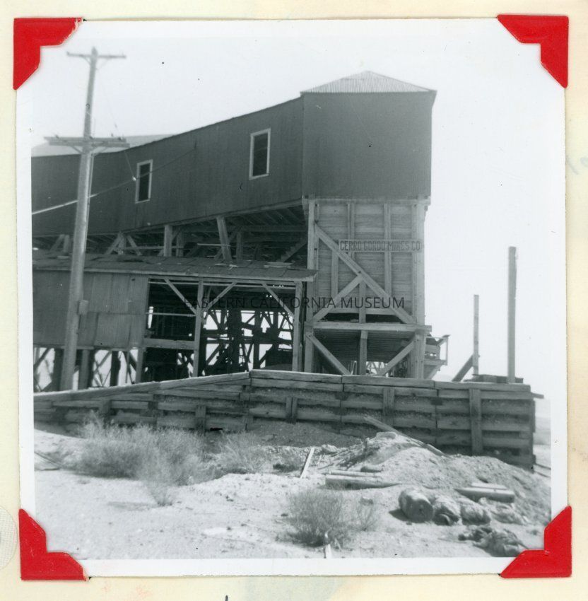 Photo of the Cerro Gordo and Keeler tramhouse. There is a sign on the side of the building that says, "Cerro Gordo Mines Co." Photo taken by W. P. Payne in 1956.