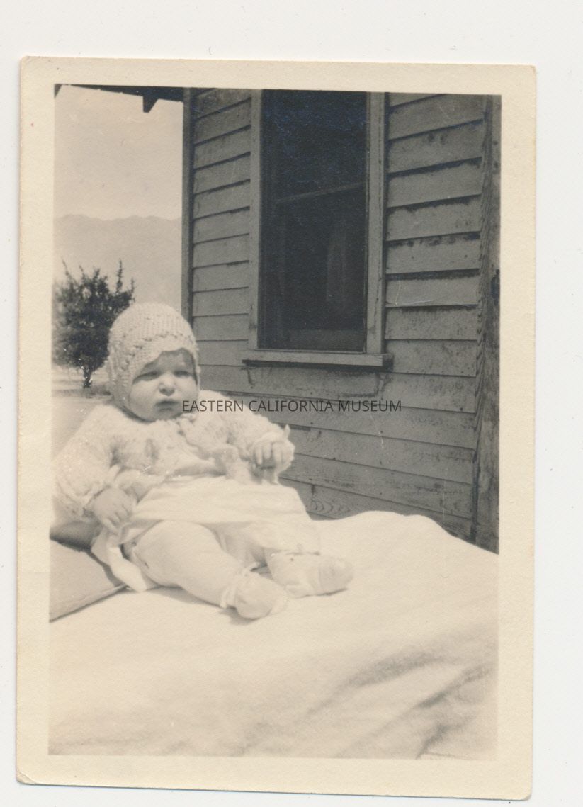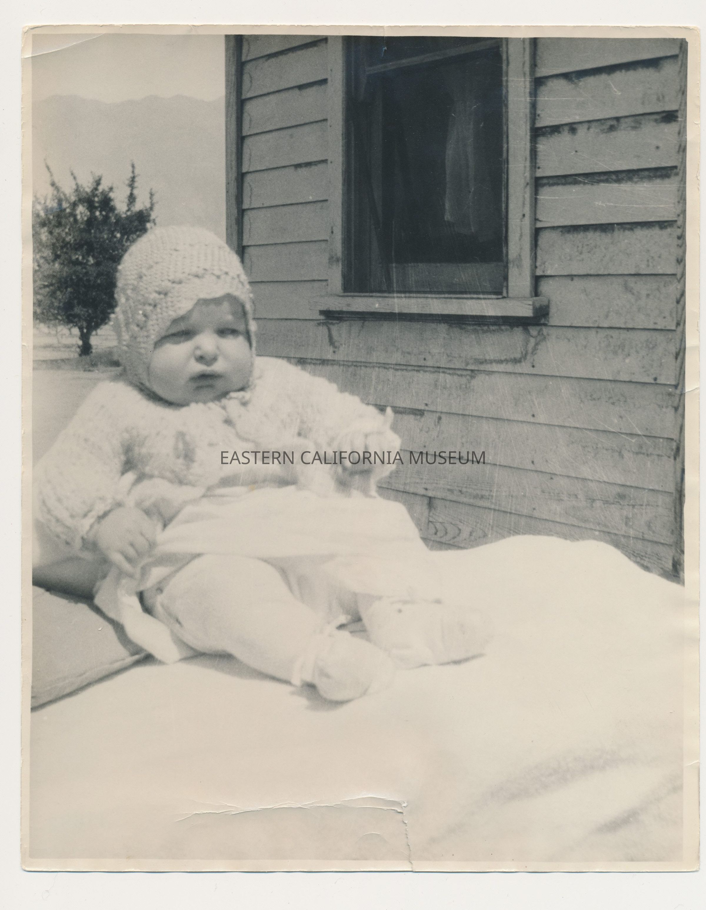 Photo of Marvin Donald Smith as a baby outside in front of a house with a tree and mountain in the background wearing a knit or crochet hat and jacket.