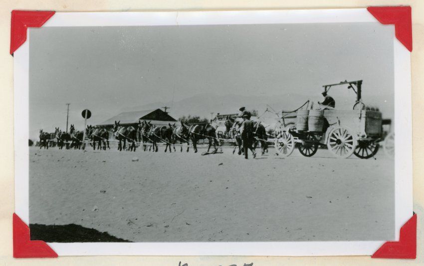 Photo of a long mule team (maybe 14?) hauling a wagon filled with casks/barrels of water to the mines (Cerro Gordo?) from Keeler. Photo copied courtesy of L. Hilderman in 1959.