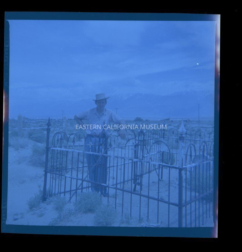 Photo of W. P. Payne posing next to a metal fenced-in plot in the Keeler Cemetery in 1957. Photo by Susan Payne.