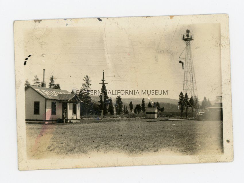 Photo of a building with "Truckee EL [elevation]" written on the roof, power lines, maybe a spotlight, and a wind sock. There is also a vehicle parked on the right side. This is likely the Truckee Intermediate Field Airport office building.Collection