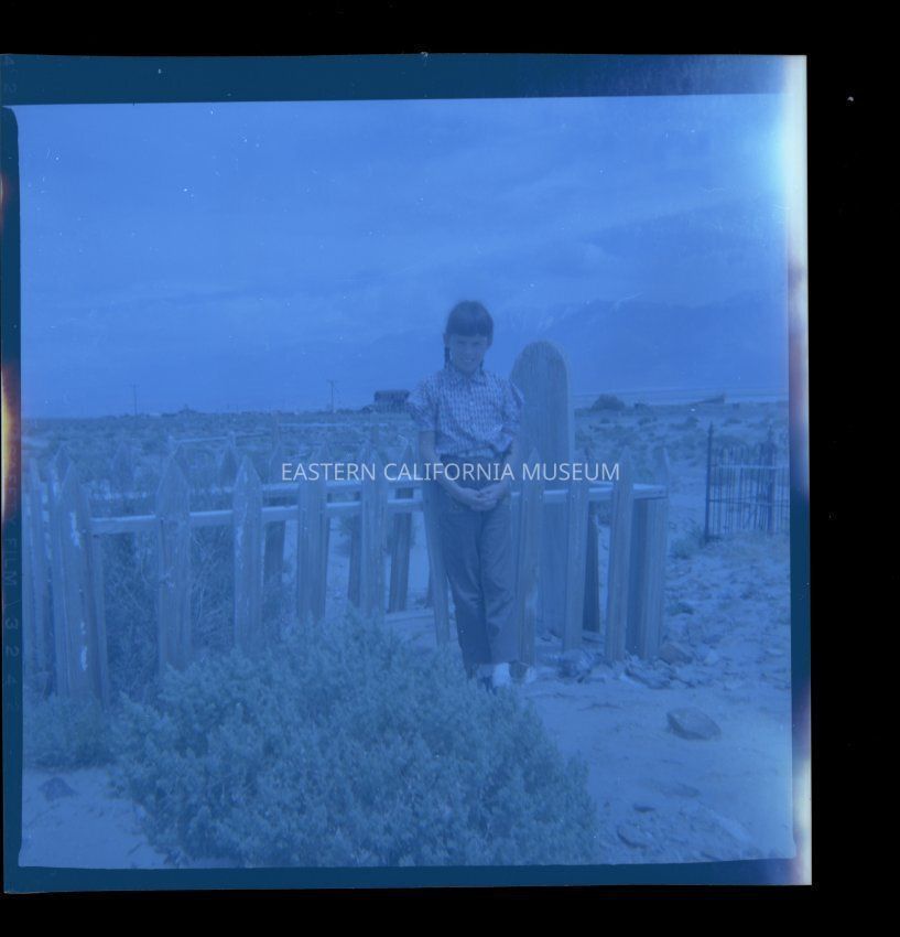 Photo of Susan Payne posing next to a wood picket fenced-in plot in the Keeler Cemetery. The wooden marker is illegible. Photo taken in 1957 by W. P. Payne.