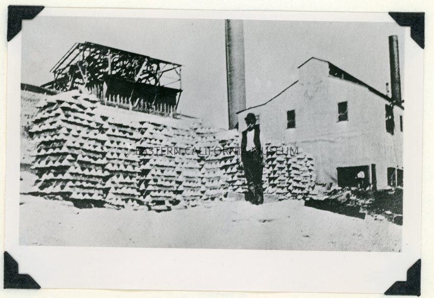 Photo of a man standing next to large stacked piles of silver-lead bullion bars from Cerro Gordo. The building in the background is likely the Four Metals Smelter. Photo courtesy of Barbara Willson and [blank] of San Jose.