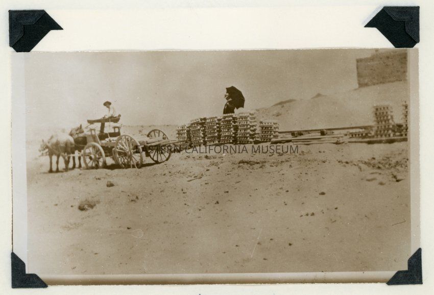 Photo of a man driving a wagon next to a large pile of stacked silver-lead bullion bars, likely outside of the Four Metals Smelter. Another man holding a black umbrella is standing behind the ingots. Photo copied courtesy of Barbara Willson and [blank] of San Jose.
