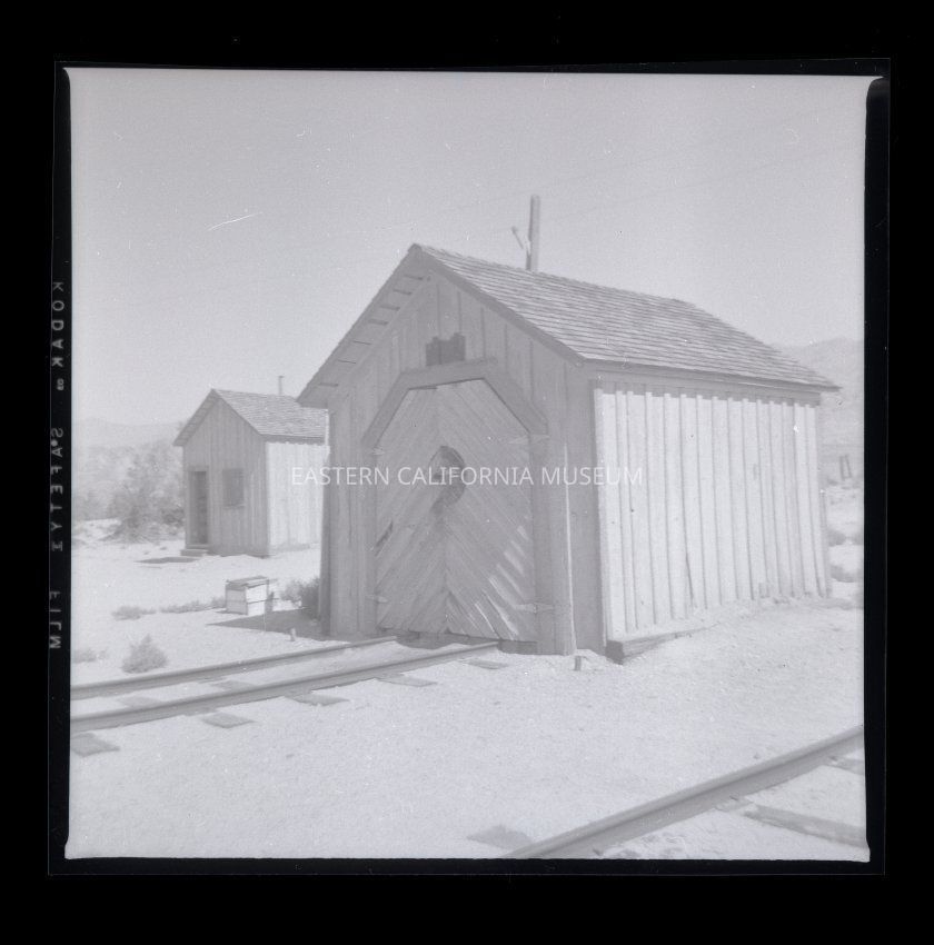 Photo of the shed for a motor car at the Southern Pacific narrow gauge railroad station at Kearsarge. Tracks lead directly into shed. Photo taken on 09/21/1958 by W. P. Payne.Made/Created