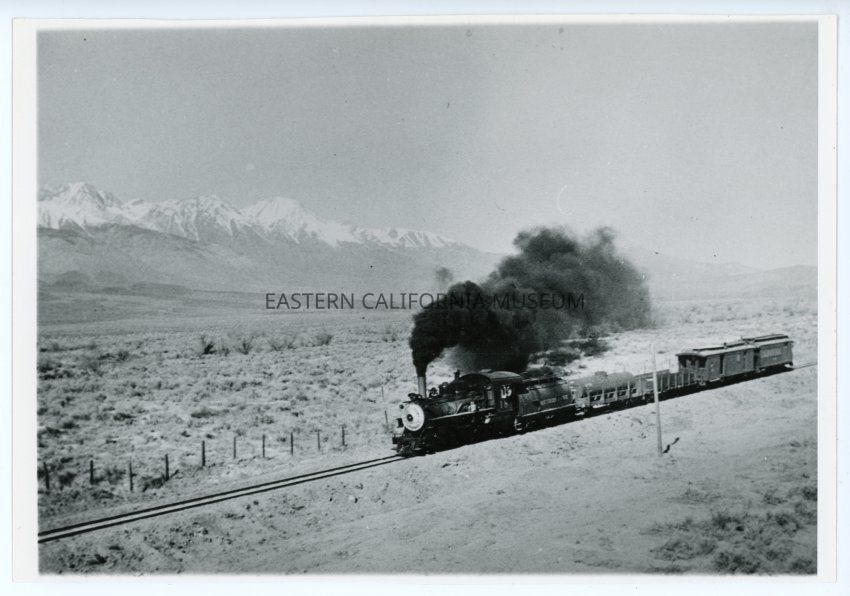 Photo of Southern Pacific engine #18 steaming along the tracks in the Owens Valley with the snow-capped Sierra Nevada mountain range in the background, about 1940. Photo copied courtesy of Mr. King of the Public Relations Department of the Southern Pacific Company in 1958.