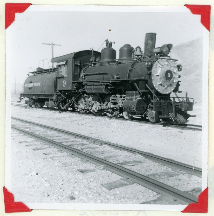 Photo of Southern Pacific engine #9 at Owenyo. Photo taken in October 1956 by W. P. Payne.
